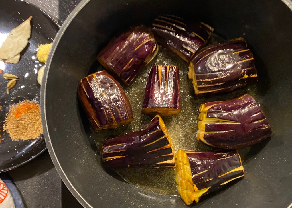 I took a big pan (where I cooked the whole meal later) and heated under medium temperature with vegetable oil. When oil gets pretty warm, add aubergine coated with spices and fry them until they start to change color. However, we don’t need to fry them completely, as they will start to break plus we will cook them once again. So we just need to shallow fry them for few minutes.