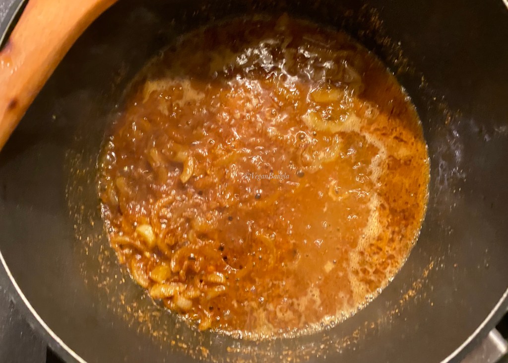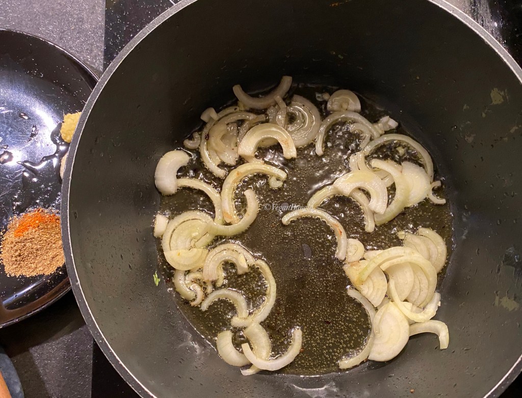 Now its time to make the gravy for the dish. In the same pan where I fried aubergine, I heated the oil first and added sliced onion and cooked until they are slightly golden.