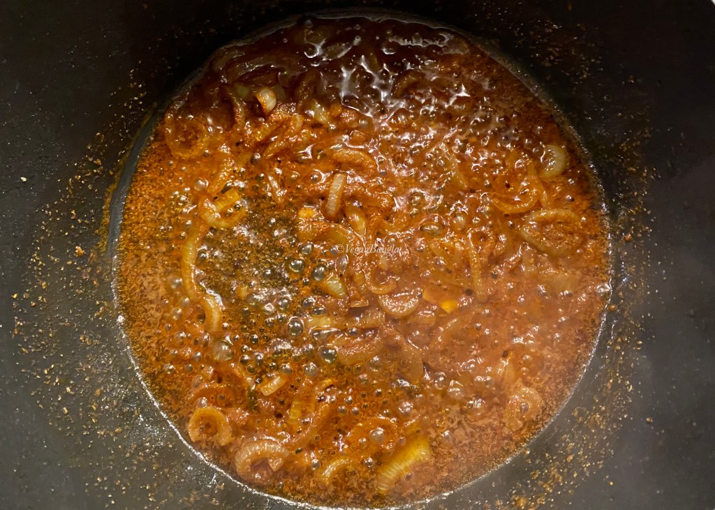 After adding all ground spices (turmeric, cumin, coriander and chili), I added 50ml water to the pan. Water will aid in cooking the spices and release the raw smell. After few minutes of cooking in medium low heat, the spices will release oil (next photo). It means that your gravy is ready.