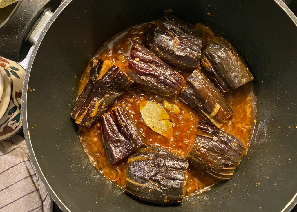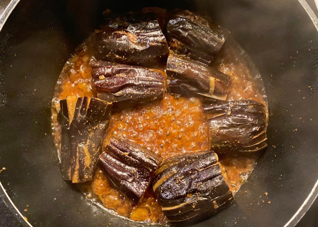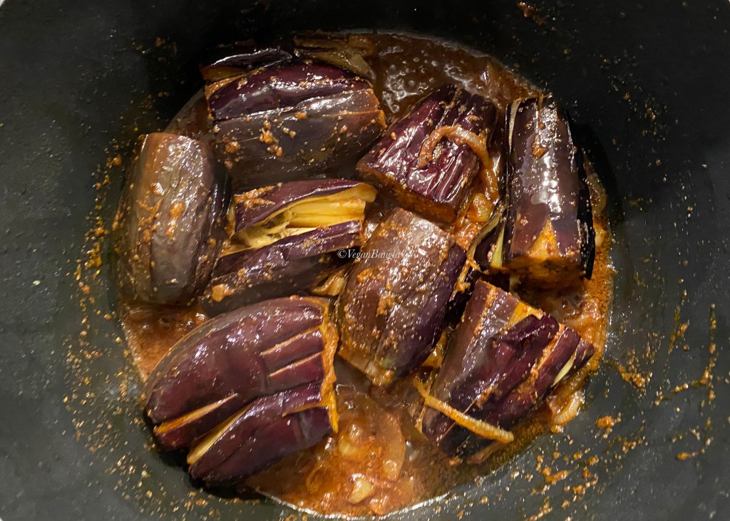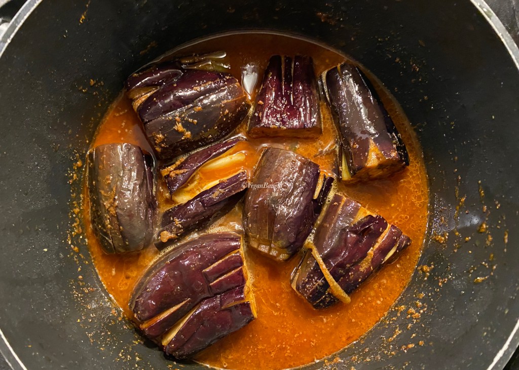 After 10 minutes of cooking the aubergine in medium heat, I have open the lid and checked of they are cooked. You can see in the picture that there are still water bubbles coming out in the first photo. So I let them cook without lid for few more minutes. As you can see in the second photo above, the curry is releasing oil now.
