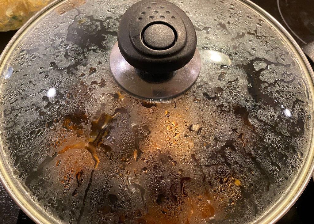 Then I added about 150ml water (or more if you want more sauce) and then cover the pot with a lid. I let the aubergine cook for about 10 minutes in medium heat. Please note that I did not stir them in between.