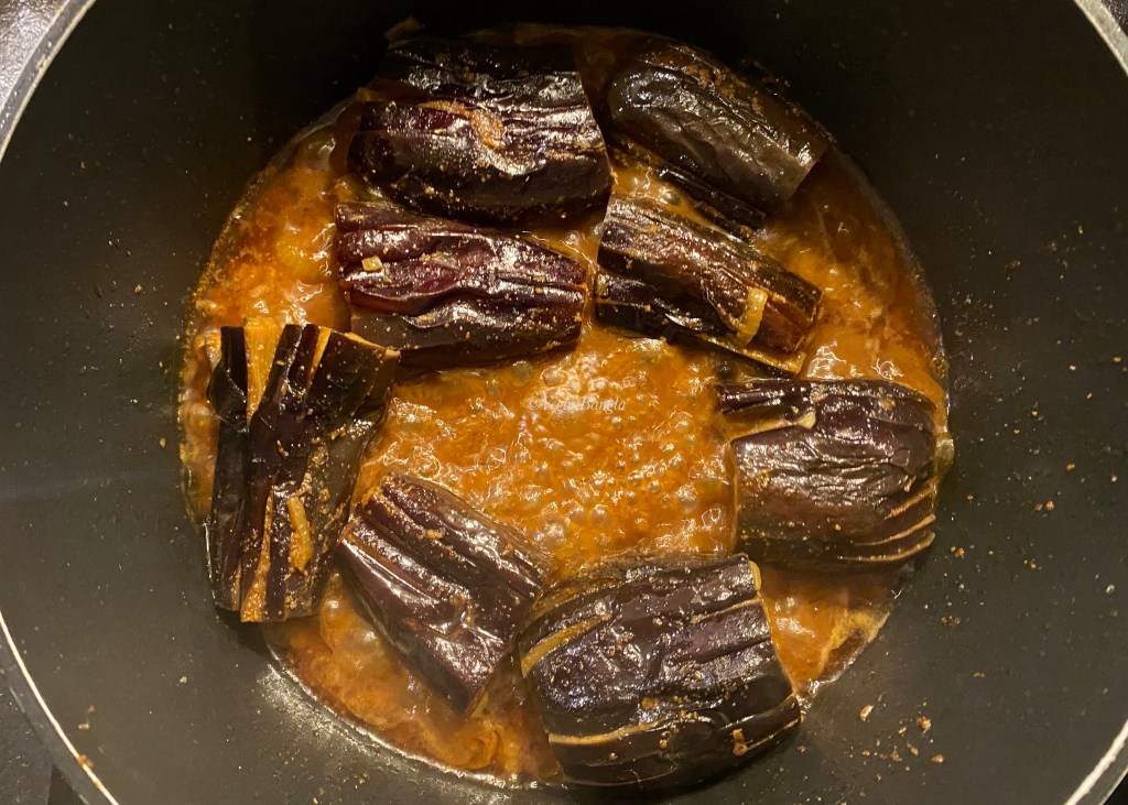 So, now its time to add the fried aubergine. I carefully added them and turned them a bit to cook in the gravy for a minute or so.