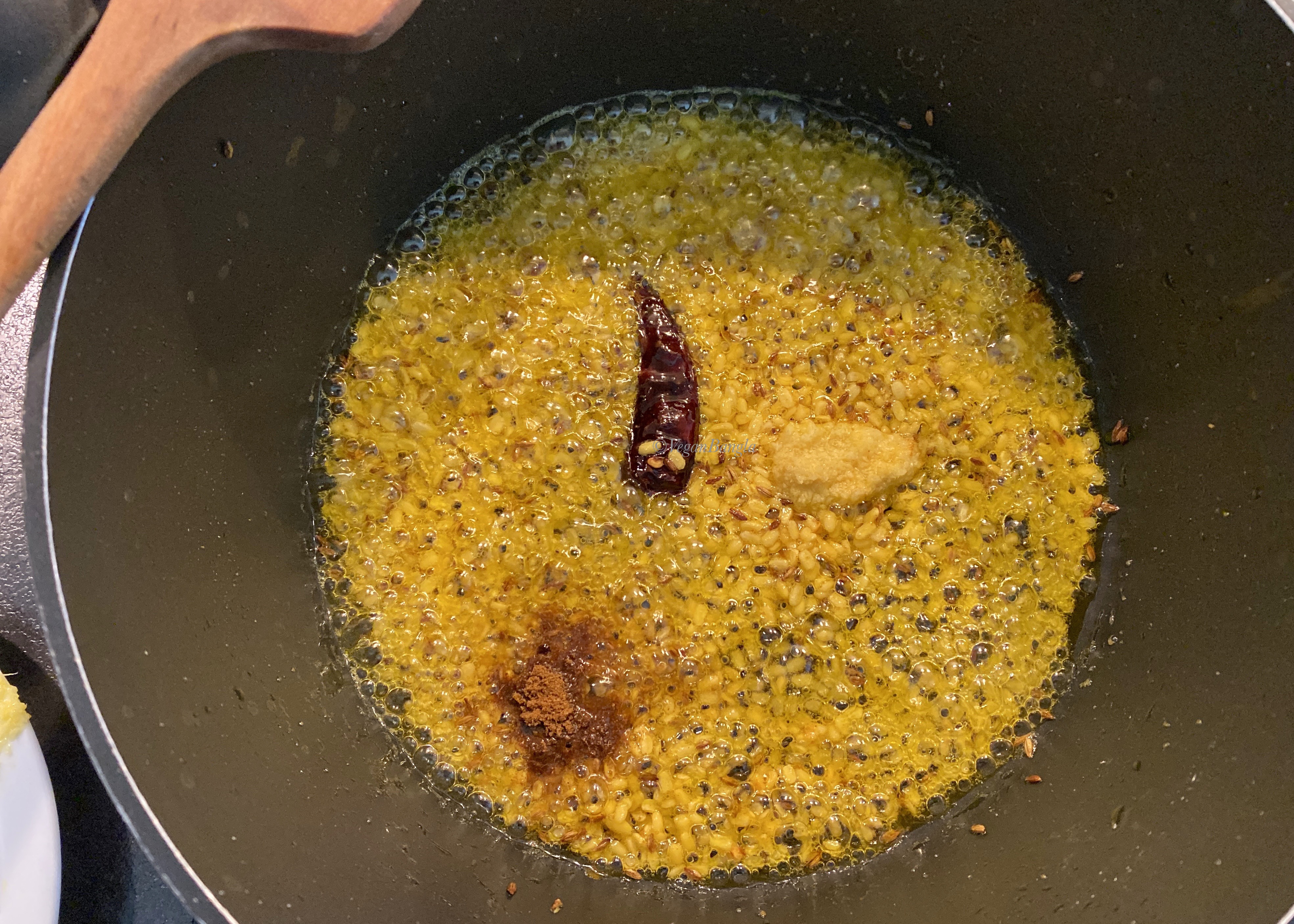 In the same pan, I added cumin seeds and dry red chili. After few seconds, when they starts to sizzle and bubble, I added soaked and washed muug daal. I cooked the muug daal for a minute or two.