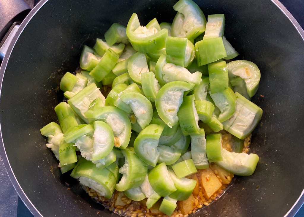 Potatoes and muug daal are nicely cooked, so now I will add chopped chichinga. I stirred them lightly so they are blended well with rest of the ingredients in the pot.