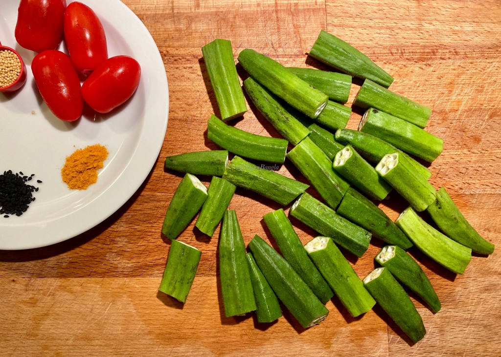 | Instruction: 1. Wash and remove okra top and end part. Cut okra in 3cm long pieces. Make a puree of the tomato or just chop it if it’s too much of a hassle to puree only one tomato. Make a smooth powder or puree of mustard seeds too. 2. In a fry pan, heat mustard oil and add okra pieces. Fry them until they are slightly golden on outside. When done, set them aside. 3. In the same pan, add nigella or black cumin seeds. When popping, add tomato paste/puree, salt, turmeric powder, chili powder and green chili paste and mix well. Cook for 1-2 minutes with lid on low-medium heat. When tomatoes starts to separate from oil, add 50ml of water and let it simmer for a minute. 4. Add mustard paste or powder to the tomato gravy. Simmer for another 2-3 minutes. When gravy starts to get thicker, add fried okra. 5. Coat okra well in gravy. Add 100ml of water again to the pan. Now cover and simmer in low heat until the gravy gets in your desired consistency and okra are cooked thoroughly. Check salt and add more if needed. Serve warm with rice or flat bread! |