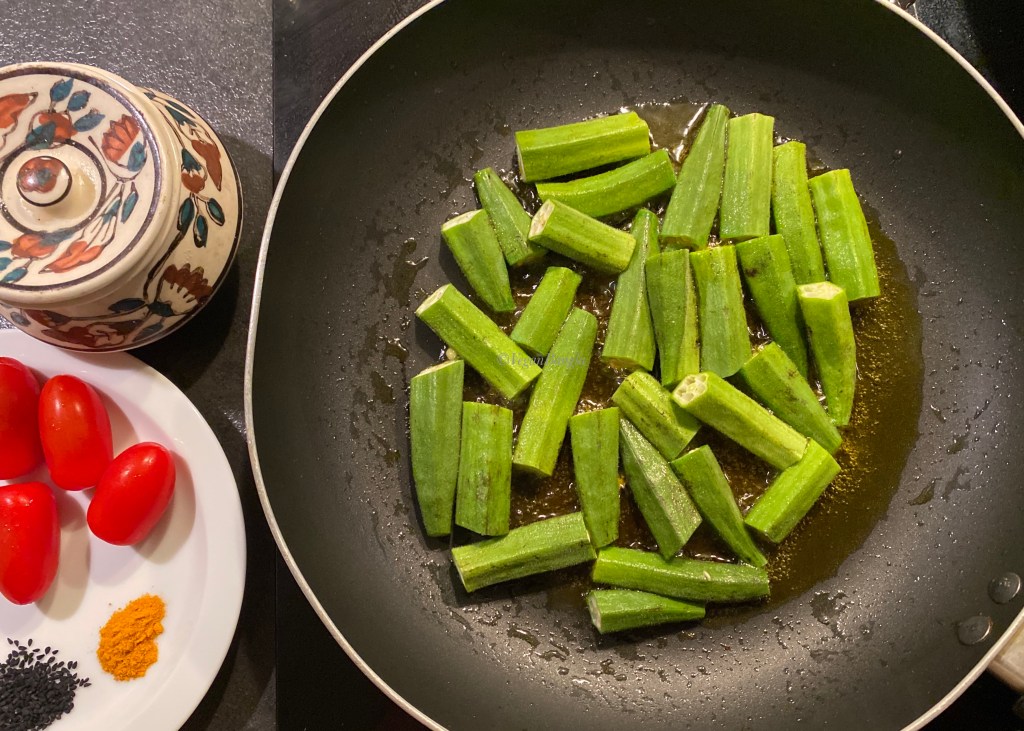 Next, in a fry pan, I heated two tablespoon or 10ml Bangladeshi Mustard oil and added okra. The purpose is to shallow fry them and increase the taste. If you skip this step, the okra might end up as soggy. I shallow fried the okra until they changed their color and slightly golden on outside.