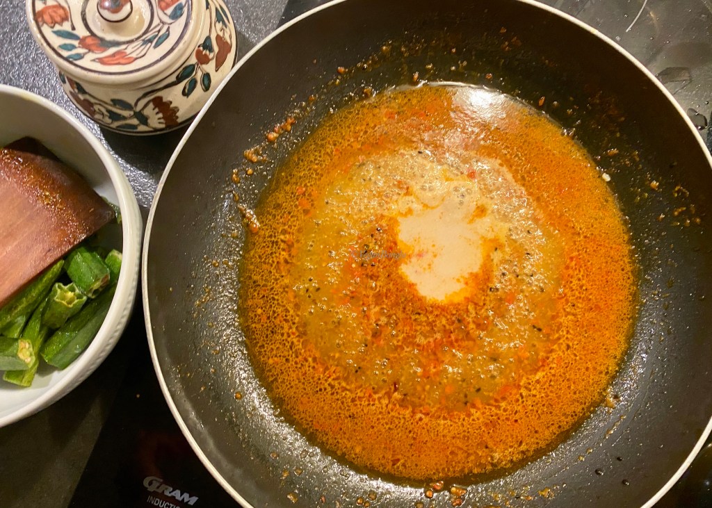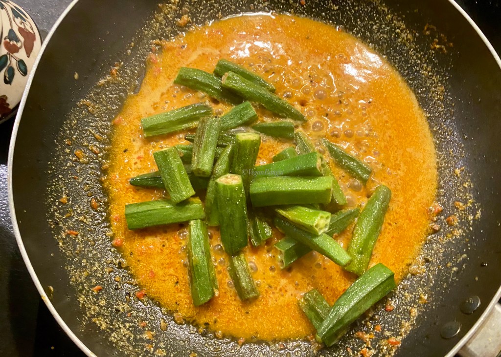 After adding water, I covered the pan with a lid and let them simmer in low heat. It depends on you how much gravy or how dry you want the dish. I like mine pretty dry, so I let the okra simmer for more than 5minutes.