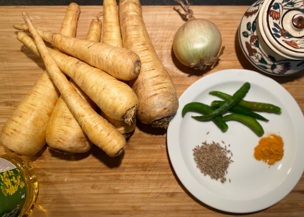 | Ingredients: 6-8 big parsnips (about a kilo) Spice and Condiments: 20ml Vegetable Oil (Olive/Mustard/Coconut oil, anything will do) 1 medium Onion 1tbs fine Salt 1tsp Turmeric powder 1tsp whole Cumin seeds 2-3 green chili (optional) |