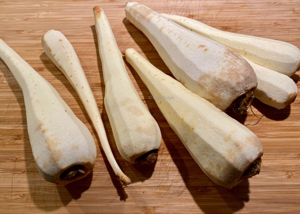 Today I am going to write another improvised vegetable recipe, which is a very typical vegetable in Europe but not found in Bangladesh! The veggie is called Parsnip! It looks like white carrot, taste almost sweet like carrot with a hint of spice and a great addition to any curry or soup! However, I am going to cook it like Potato stir fry, following the exact same recipe, which means you can eat it in breakfast with hand made flat bread (ruti or porota) or eat this for lunch or dinner with rice or Khichuri!