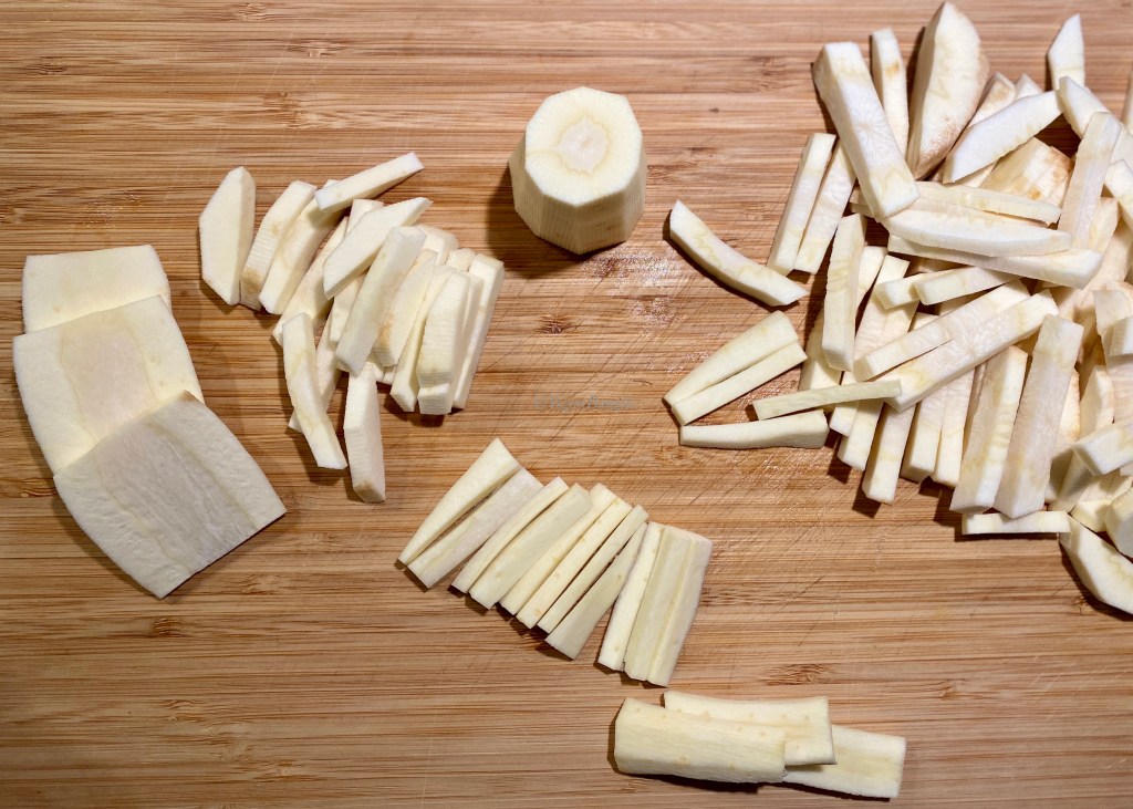 I have started my prepping by peeling the parsnip first. It has a dull colored skin outside which is not visually appealing, so I decided to peel them first. Then I have sliced the parsnips in thin long strips, about half a centimeter thick and three centimeter long. It may take more time than usual to slice the parsnips, as they have very hard texture. So take your time and slice them uniformly. You can cut them in any shape you want, but make sure they are not too thin or thick. If parsnips are too thin, they will stick to each other and if too thick, then they won’t cook properly, as there’s no use of extra water in this recipe!