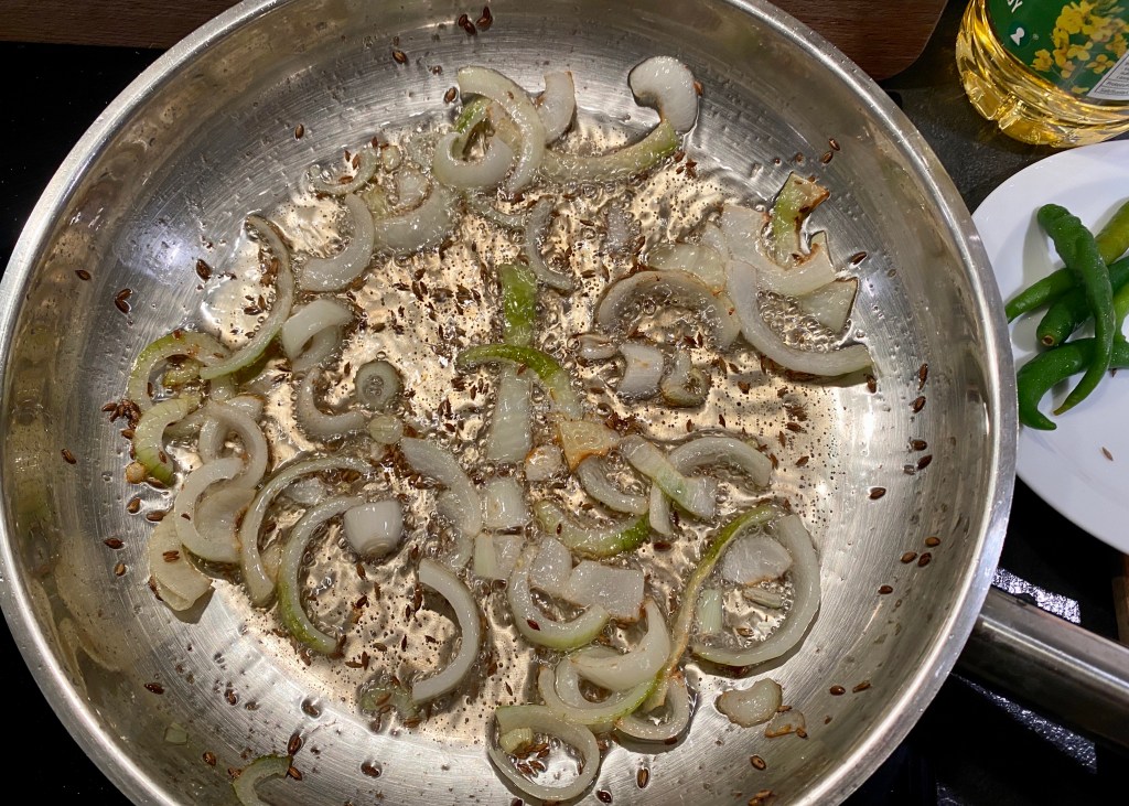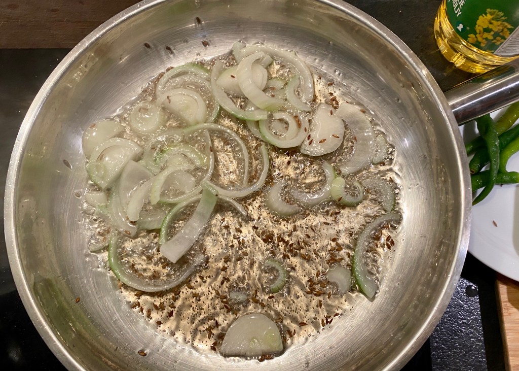 After I was done with prepping, I heated vegetable oil in a deep heavy bottom pan over medium heat. Then I added whole cumin seed when oil was warm and cooked the seeds until they start popping. I added thickly sliced onion to the pan and sauteed until they were golden.