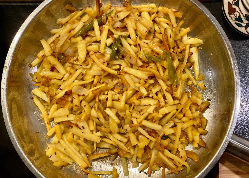 You can see in the picture how the color of parsnips look like, slightly translucent and roasted from all the stir frying. By this time, they also should give a really nice aroma of fried cumin and turmeric!