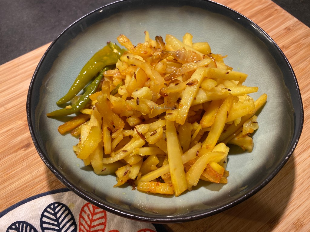| Instruction: 1. Wash and peel the skin of parsnip first. Then cut them in half cm thick and 3 -4 cm long stripes. Slice onion slightly thick. 2. Heat oil in a large pan over medium heat, put whole cumin seeds. When they start to pop, add sliced onion and fry them until golden brown. 3. Add sliced parsnip, turmeric, salt and chili. Stir fry them for 10- 12 minutes until parsnips are slightly roasted. 4. Cover the pan and reduce heat to low; cook them for 10 minutes until parsnips are soft. Add very little water if you want. Check salt and add more if needed. 5. Uncover pot, check if parsnips are soft and cooked through. Cook for 2 more minutes until excess moisture evaporates. 6. Turn off heat and take parsnips bhaji and garnish with coriander leaves as desire. Enjoy with rice or flat bread or tortilla! |