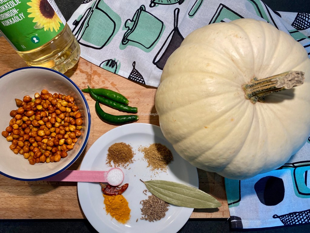 | Ingredients: 1kilo of Pumpkin 100g Chickpea (dried and soaked or canned) Spices and condiments: 2 Green Chili 1 Dry red Chili 1 Bay leaf 1/2 teaspoon cumin seed 1/4 teaspoon of Turmeric powder 1/2 teaspoon Coriander powder 1/2 teaspoon Cumin Powder 1/4 teaspoon of sugar 10ml Mustard oil/Vegetable oil 1teaspoon Salt |