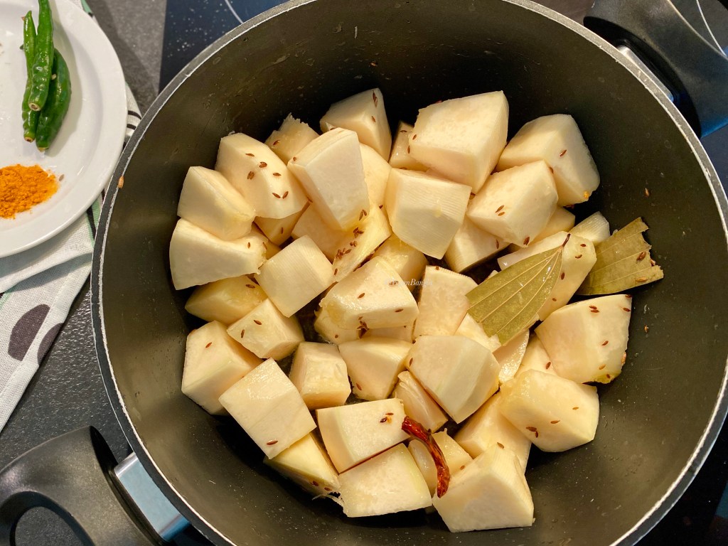 Next step would be to heat up some vegetable oil in a deep pan. I have used white vegetable oil because I did not want to overpower with flavor of mustard oil, which I love to use in my cooking. Then I added half teaspoon of cumin seeds, a bay leaf and a dried red chili. If you want, you can avoid dry chili but these are just for flavor, not heat. So once the cumin starts to pop, I added diced pumpkin cubes to the pan.