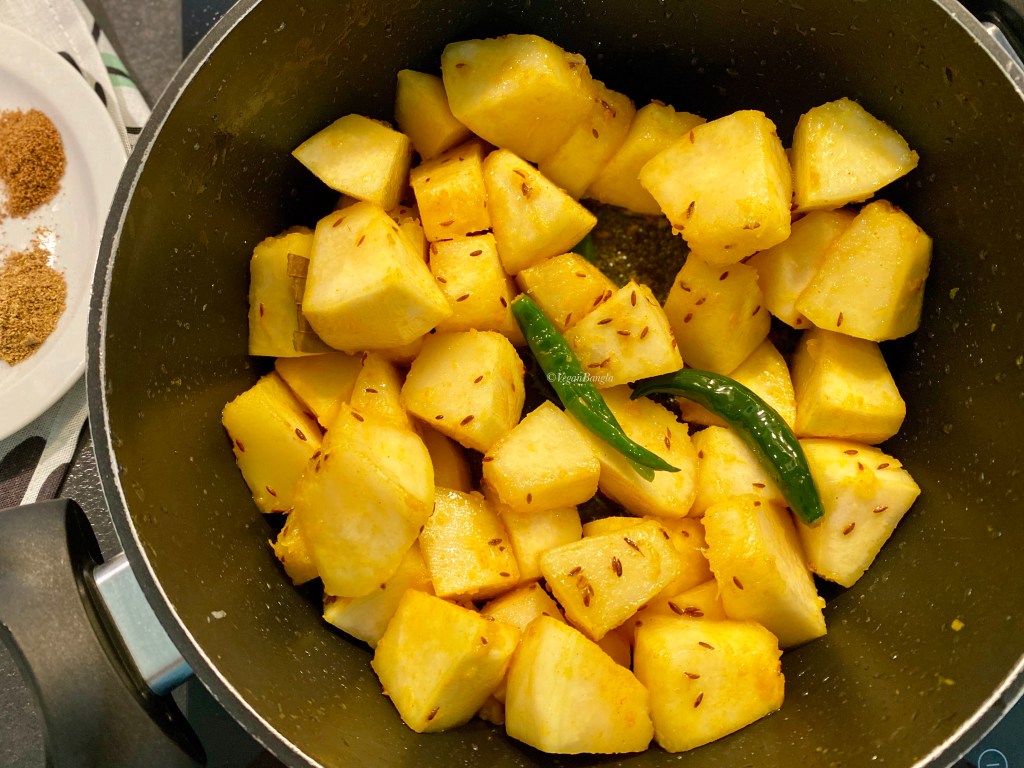 Actually I have added an extra ingredient in this dish, which is sugar. Many people from older generation in Bangladesh used to add pinch of sugar to the dish, to enhance the flavor. However this practice is almost gone in Bangladesh over time, but since today’s dish is decade old, I am following the old recipe. So I added quarter spoon of sugar to the veggie and stirred again in the same way. As you can see in the photo, pumpkin look almost cooked even though I did not add single drop of water!