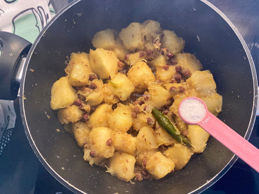 I added the boiled chickpeas, few green chili, cumin and coriander powder and then gave them a very good stir. I kept stir fry them in low heat, so they don’t get burned from the bottom.