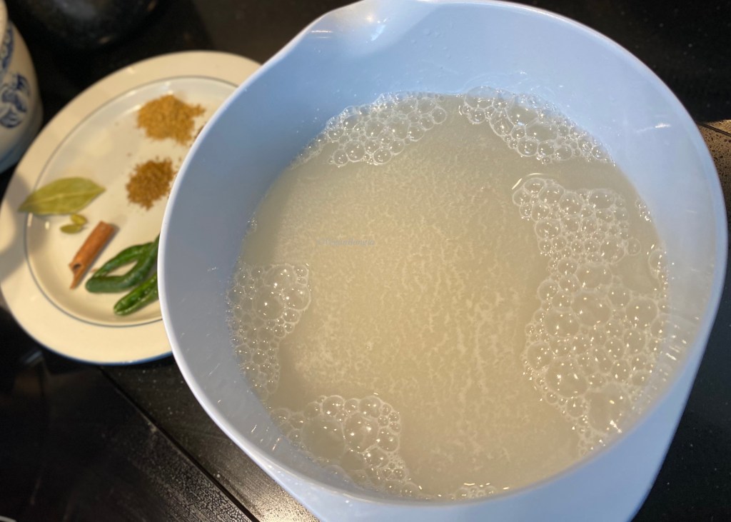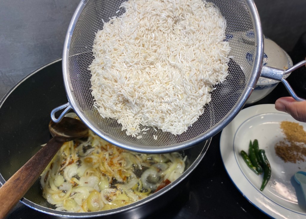 First, wash rice with cold water 4 to 5 times. If you see the first picture on the left, how dirty the rice is! That’s why we Bangladeshis always wash rice before cooking. Then drain the water and let the washed rice sit on a colander, so that extra water leaves. This step is very important because if there’s water left, it would be soggy and hard to fry the rice.