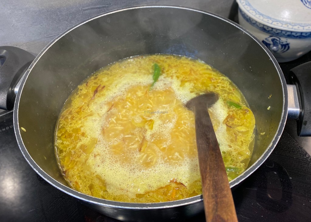 After frying the rice, add the boiled water. Turn water and rice mix it well, so all the ingredients are mixed well. Keep cooking in medium flame.