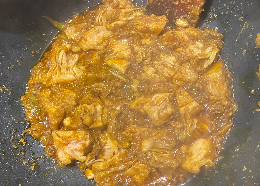 If the jack-fruits were fresh, I mean not from can, I would fry them into oil before adding to spices. But I can’t do it with these canned ones, as they are already soft. So I let the pieces soaked and fried in spices for a few minutes on both sides. We call this step in Bangla as Koshano (কষানো) or Bhuna (ভুনা).