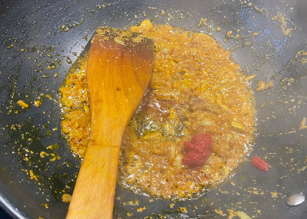 While all the spices getting cooked, I took liberty to add some tomato paste, but it is completely optional. Tomato paste brings a nice colour to the curry, although I do not like the sour taste of tomato, so I added just a tea spoon.