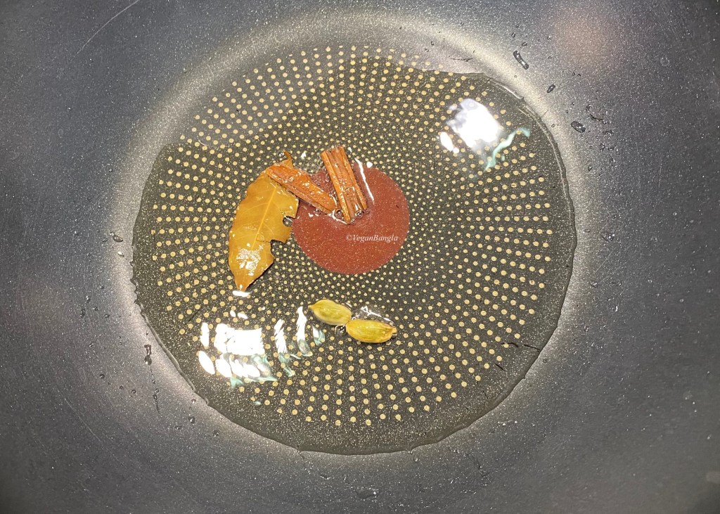I heated 2 table spoons of oil and added cinnamon stick, cardamom and bay leaves, let those release aroma for half a minute.