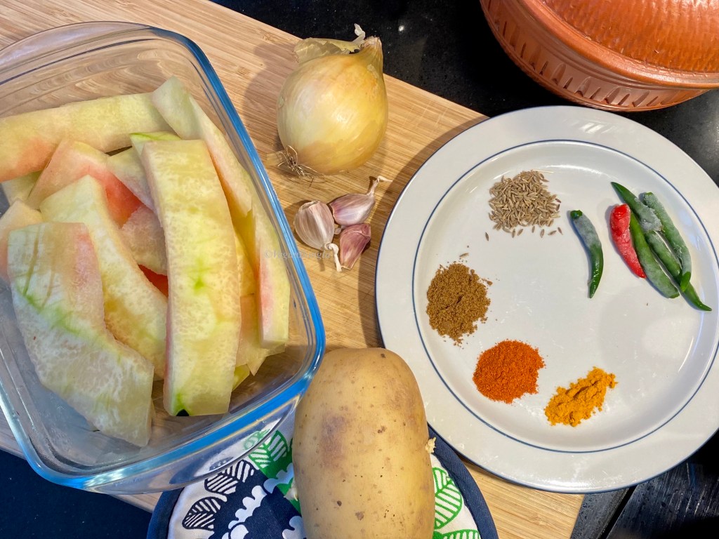 | Ingredients: 250g of white parts of watermelon 1 big potato Spice and Condiments: 20ml Vegetable Oil 1 medium white onion 1tbs fine Salt 1tsp Turmeric powder 1tsp Coriander powder 1tsp Cumin powder 2-3 Chili (optional) |