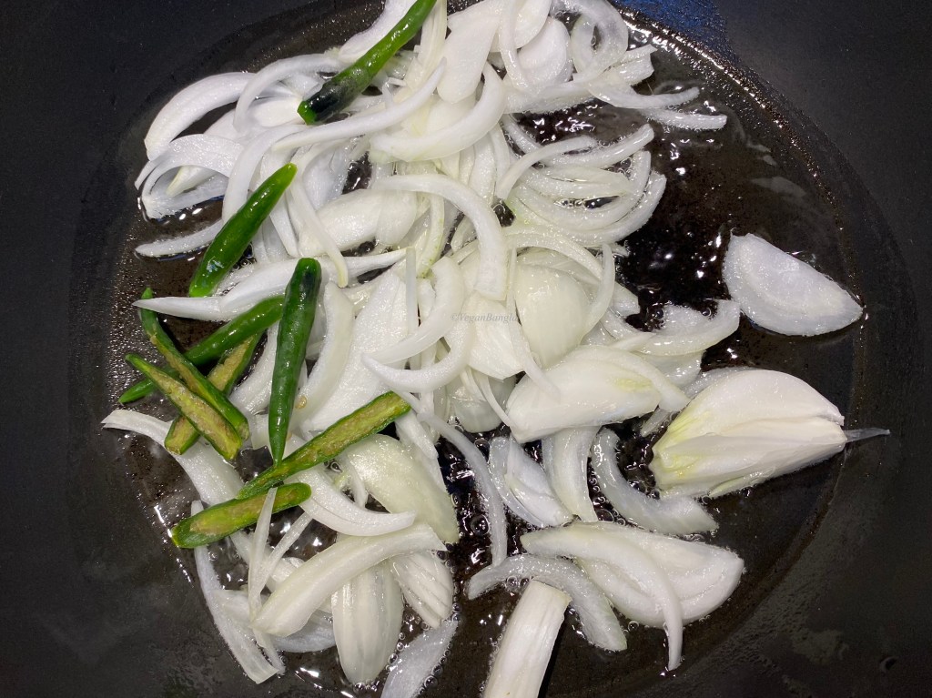 First I sliced onions and sauteed them in oil. I also added sliced green chilies.