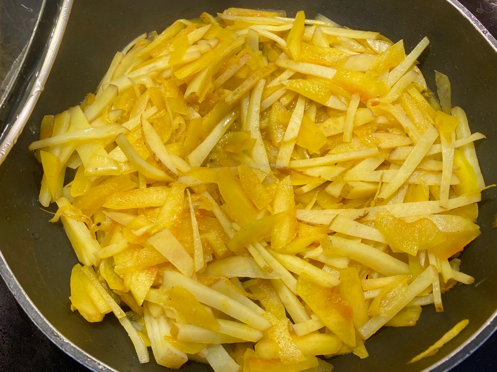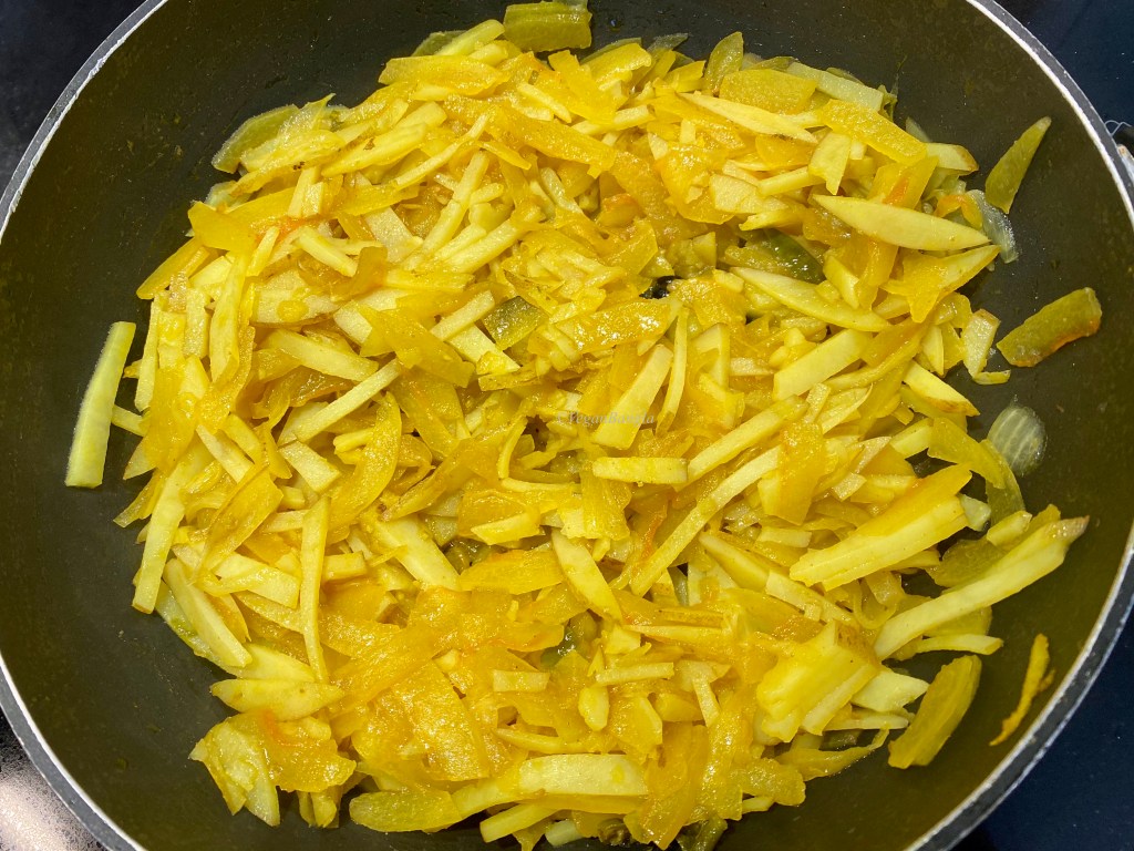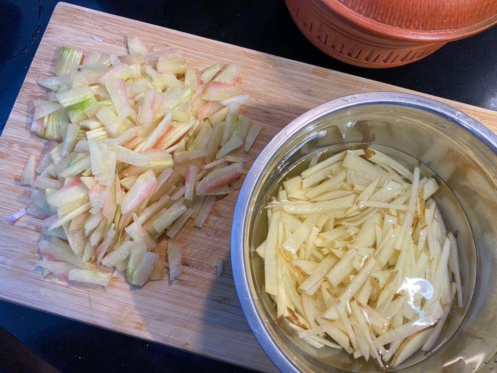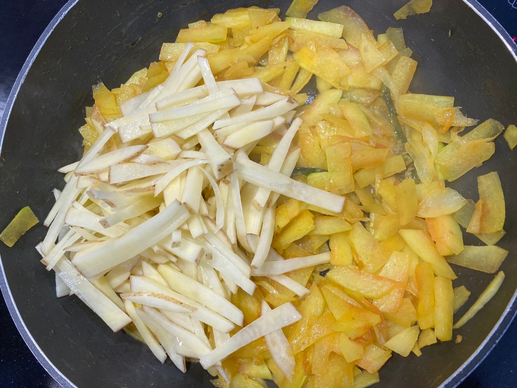 Meanwhile I sliced the watermelon rinds pretty thin. I also sliced potato, washed and put them in water, so that they don’t get brown.
