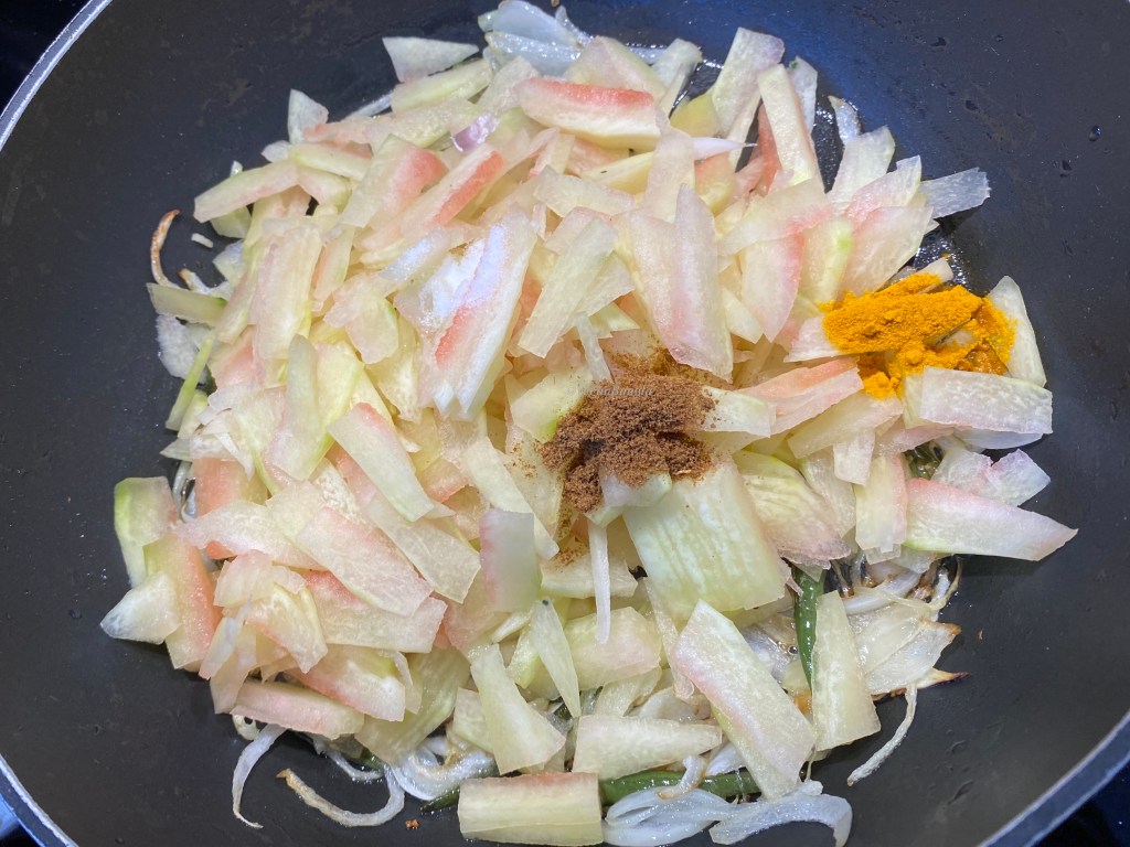 | Instruction: 1. Heat 2 table spoon of oil in a wok or skillet. Add sliced onions and fry until golden brown. Add salt to soften onion. 2. When onions are golden brown, add white parts of watermelon and all the dry spices. Stir well so they are well combined. Continue to cook in a medium heat. 3. Cover the pot for 10 minutes so the veggies get softer and cooked. Put them in low heat. 4. Check if they are cooked and continue cooking without lid. 5. When the veggies look cooked and translucent, put them down. Serve with white rice. |