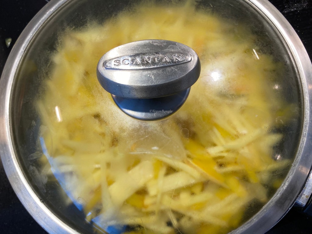 Then I covered the pot with lid and put down the temperature in low heat. It is because to trap the moisture inside and let the veggies cook without extra water.