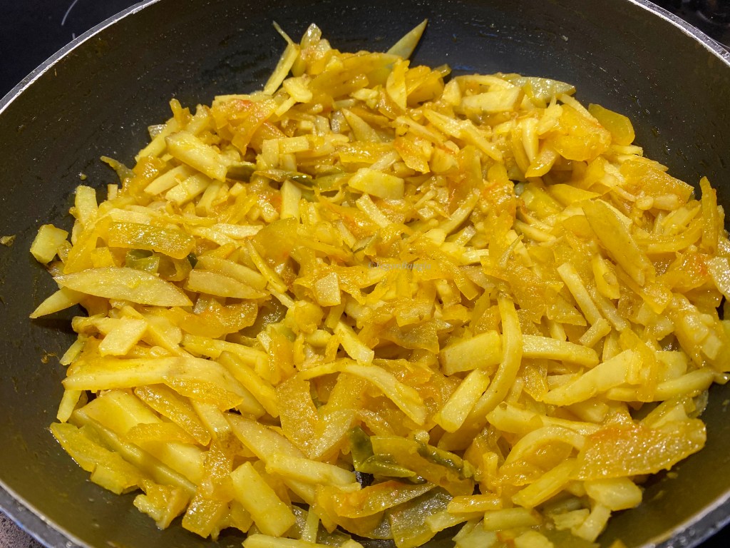 I stirred them well and let them cook all together for five to six minutes. The temperature of the stove was medium low. As I did not add any extra water, so I was careful with the temperature, otherwise they would get burnt easily.