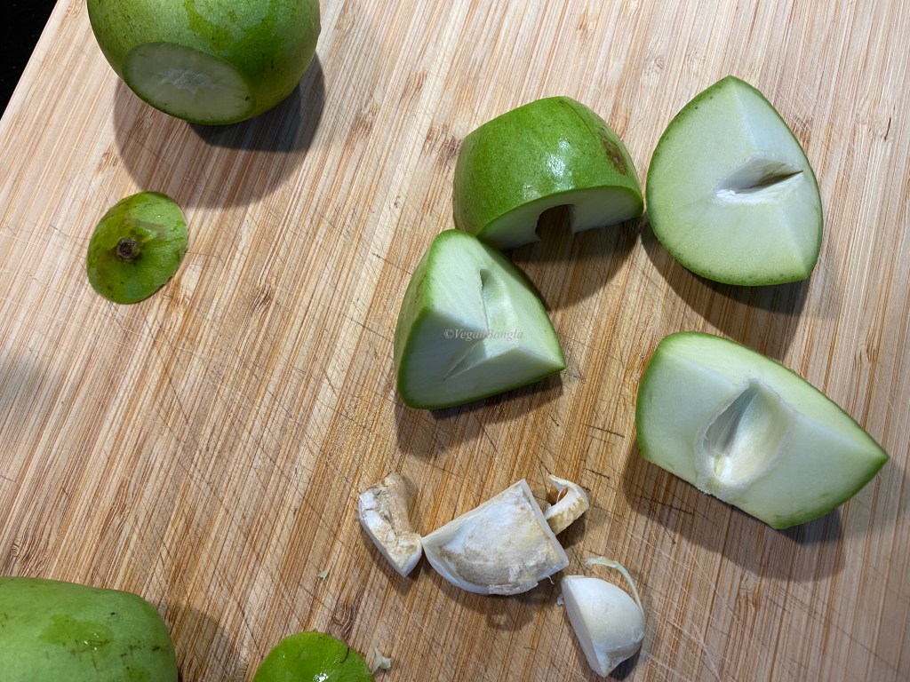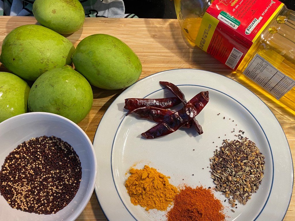 | Ingredients: 1 kilo of green mango Spice and Condiments: 400ml Mustard Oil 1.5 Tbsp Yellow Mustard 1/2 Tbsp Red Mustard 2 Tbsp Paach Phoron 1 tsp fine Salt 1 tsp Turmeric powder 1 tsp red Chili powder 2 Tbsp Garlic paste 100ml of White Vinegar 2-3 Dry red Chili (optional) |