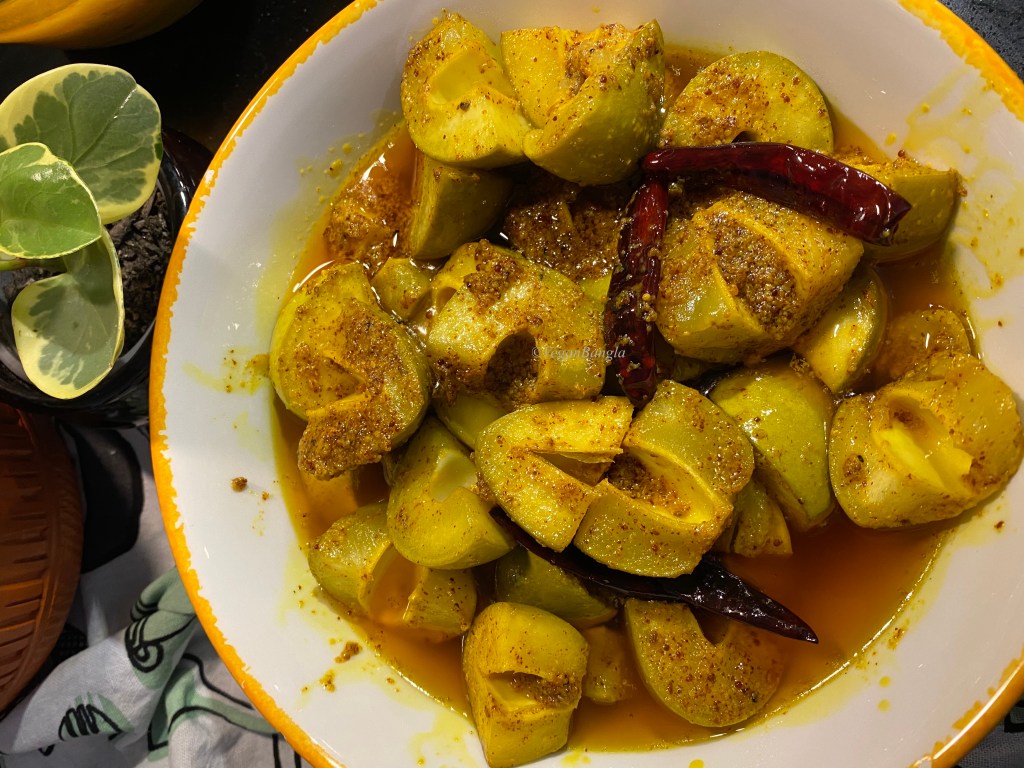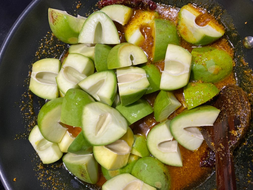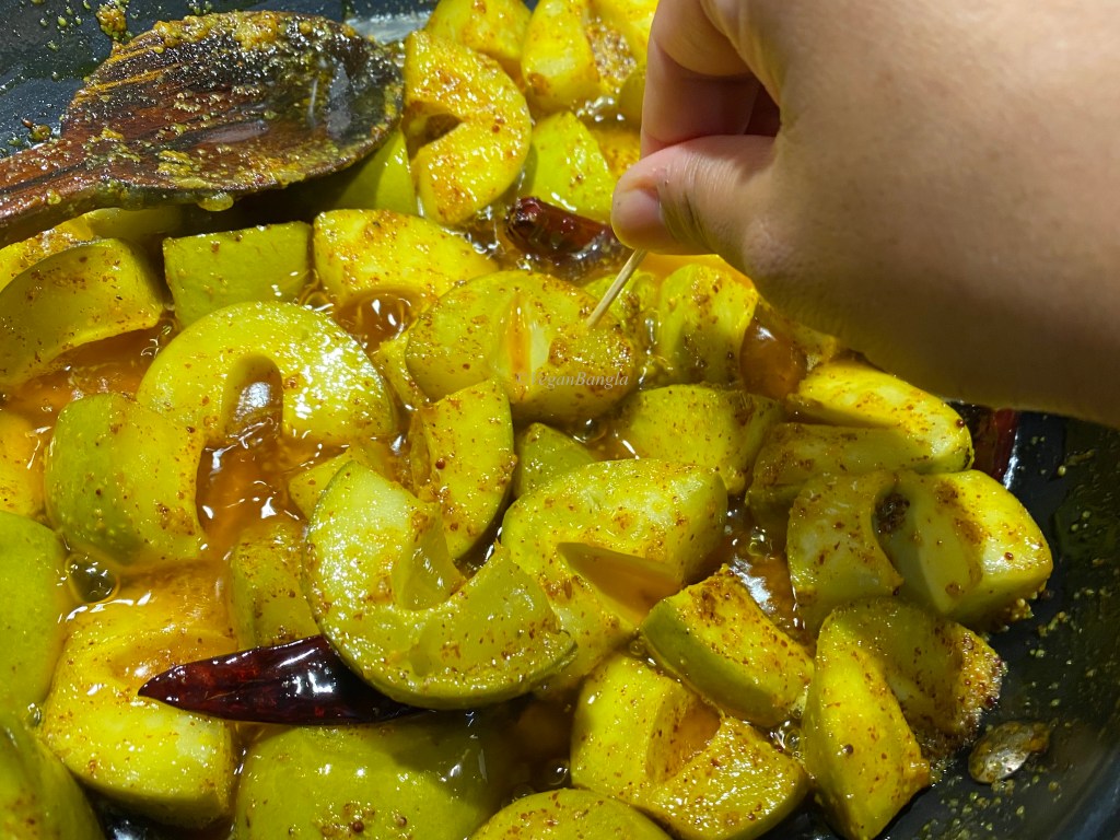 | Instruction: 1. Wash mangoes with cold water and pat dry. Cut them in four pieces and take out mango seeds and white vein. 2. In a big bowl, add mangoes, 1 table spoon of salt and 1 table spoon of vinegar and water. Mix well, and let them rest for 1 hour. 3. Dry grind yellow mustard and paach phoron. Then make a paste by adding garlic paste, turmeric powder, vinegar, red chili powder. 4. After an hour, drain mango and pat dry well, so there’s no trace of water. If necessary, dry them in oven for 10 min. 5.Heat mustard oil in a big wok. Add dry chili and spice paste mix. Cook in medium heat and continue to stir. 6. Add dried up mangoes and stir mix them well. Add salt too. The heat is still medium and be careful with the stirring, so the mangoes don’t get break. 7. After 10 minutes, check with toothpick is the mango is cooked. When the outer skin of all mangoes turns to pale green, turn off the heat and put all the pickles in a bowl to cool down. 8. Store them in a glass jar after cooling pickle completely. 9. Leave the jar in sunlight for two weeks, without the lid and top covered in clean cloth. |
