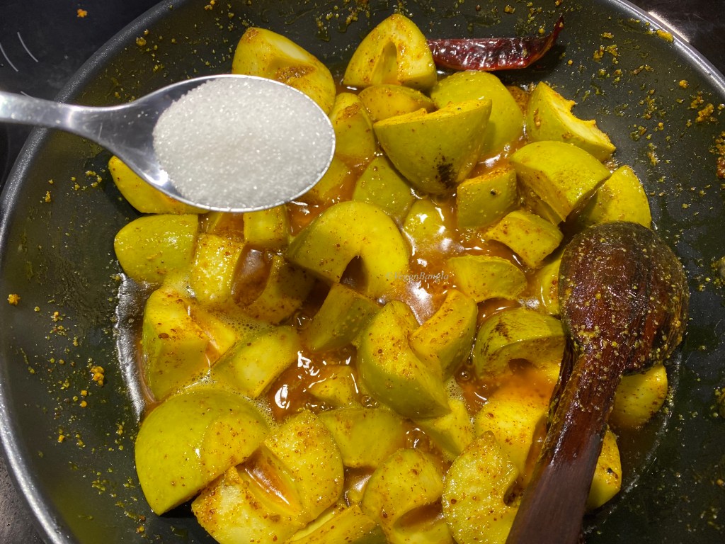 Although this mango pickle recipe is sour, I have added just a tea spoon of sugar just to increase the taste. It will not make the pickle sweet but will help in enhancing the flavor a lot.