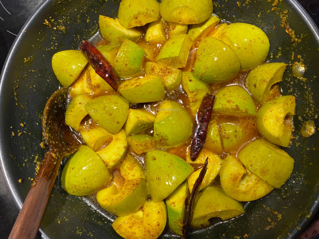 The third important step is to transfer the mango immediately when they are fully cooked. Otherwise the species will get burned by the heat and make the pickle bitter.