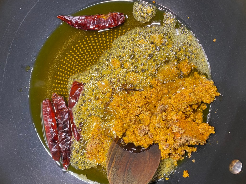 I took a big wok, added and heated mustard oil in medium heat. When oil was heated, I added dried chili first and spice paste which I prepared beforehand.