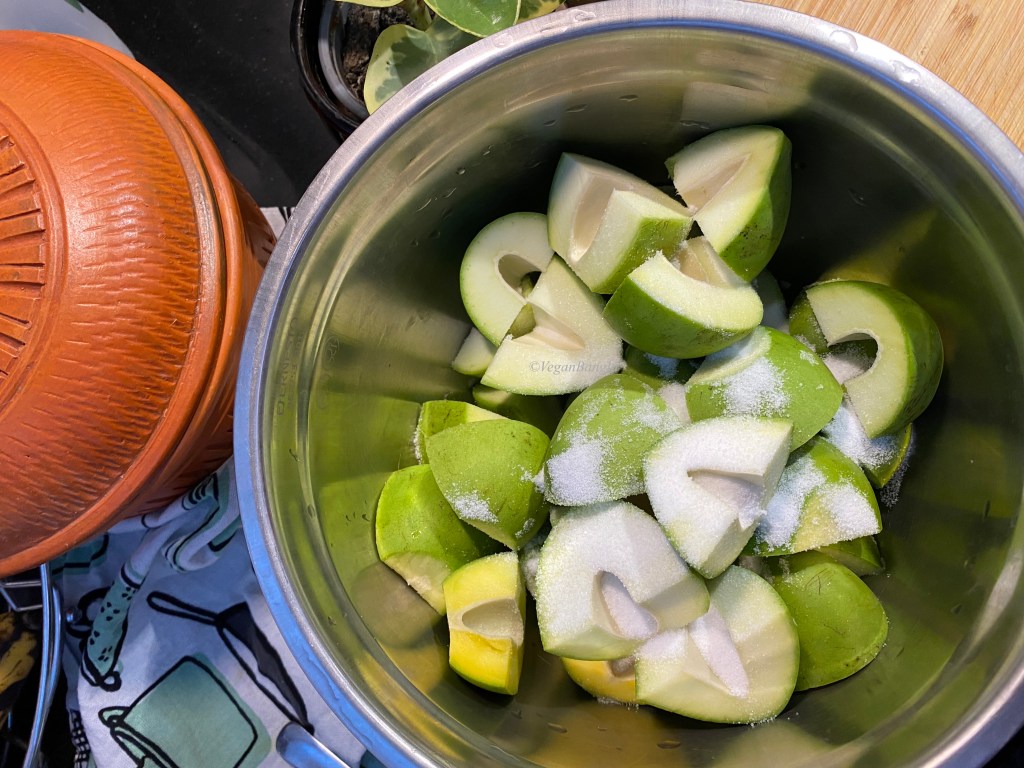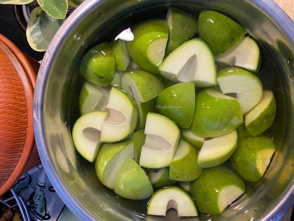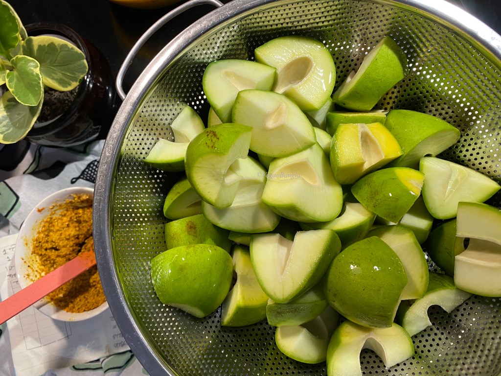 Usually in Bangladesh, we sun dry them at this point, so that mango stays in texture. Since we don’t have scorch sun in Denmark, I have took this extra step. I took all mangoes in a bowl and added 1 tea spoon of salt and 1 table spoon of white vinegar.