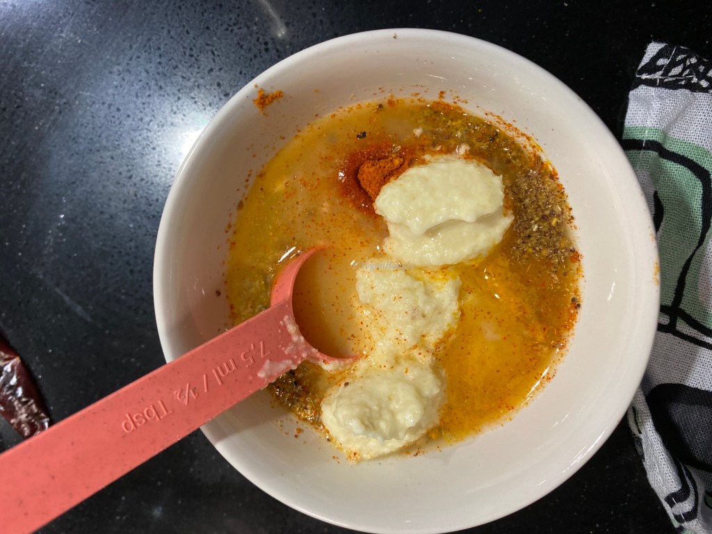 Then I made a paste by mixing all the dry and wet ingredients (except for oil) like garlic paste, white vinegar, turmeric and dry red chili powder.