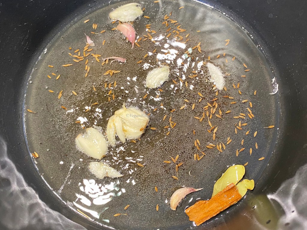 In a deep pan, heat vegetable oil and add whole cumin, bay leaf, cinnamon stick. When they start popping, add some pounded garlic and let it fry for a minute.