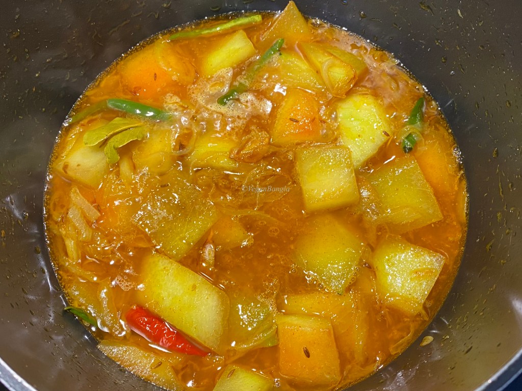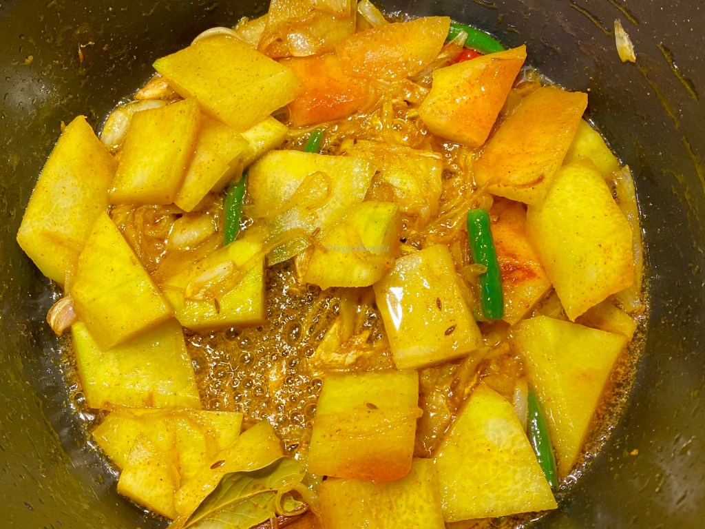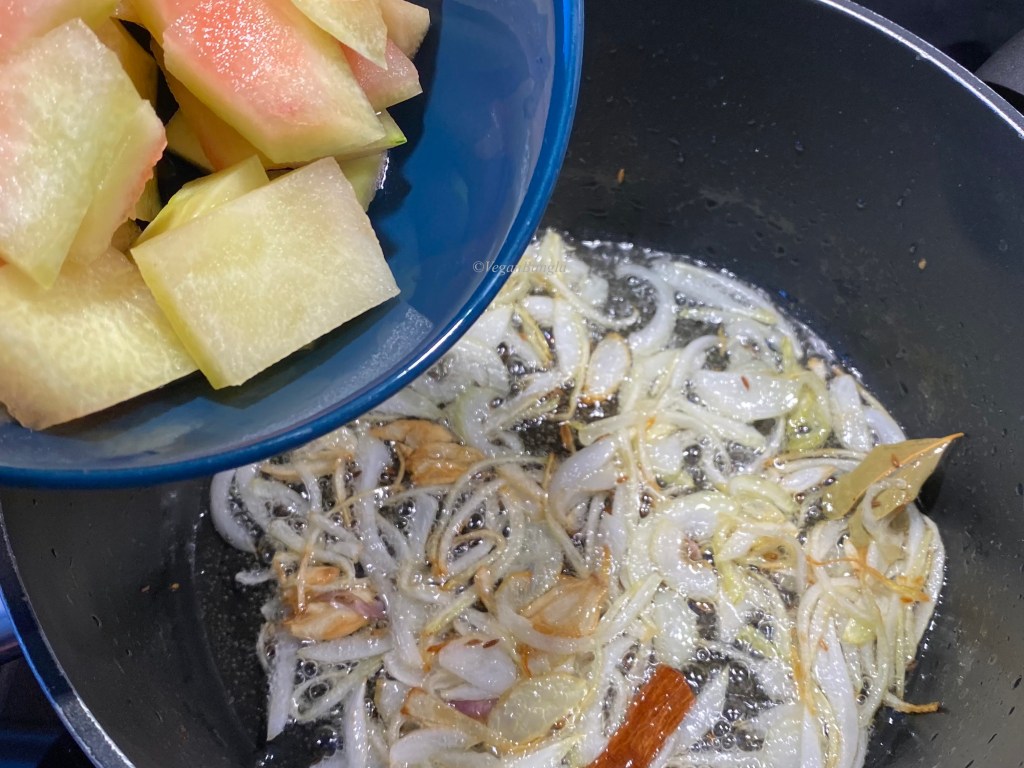 Stir cook the watermelon rinds with all spices for 2-3 minutes. This will add a roasted taste to the rinds, as they usually are of neutral taste. As you can see the difference in the picture, rinds get bit translucent after few minutes of stir cooking.