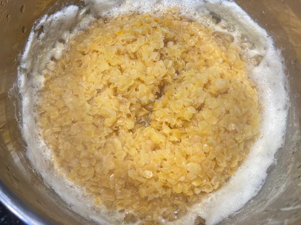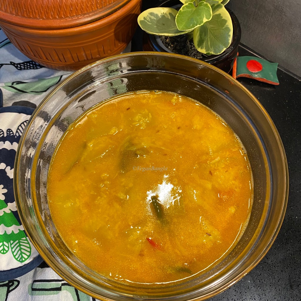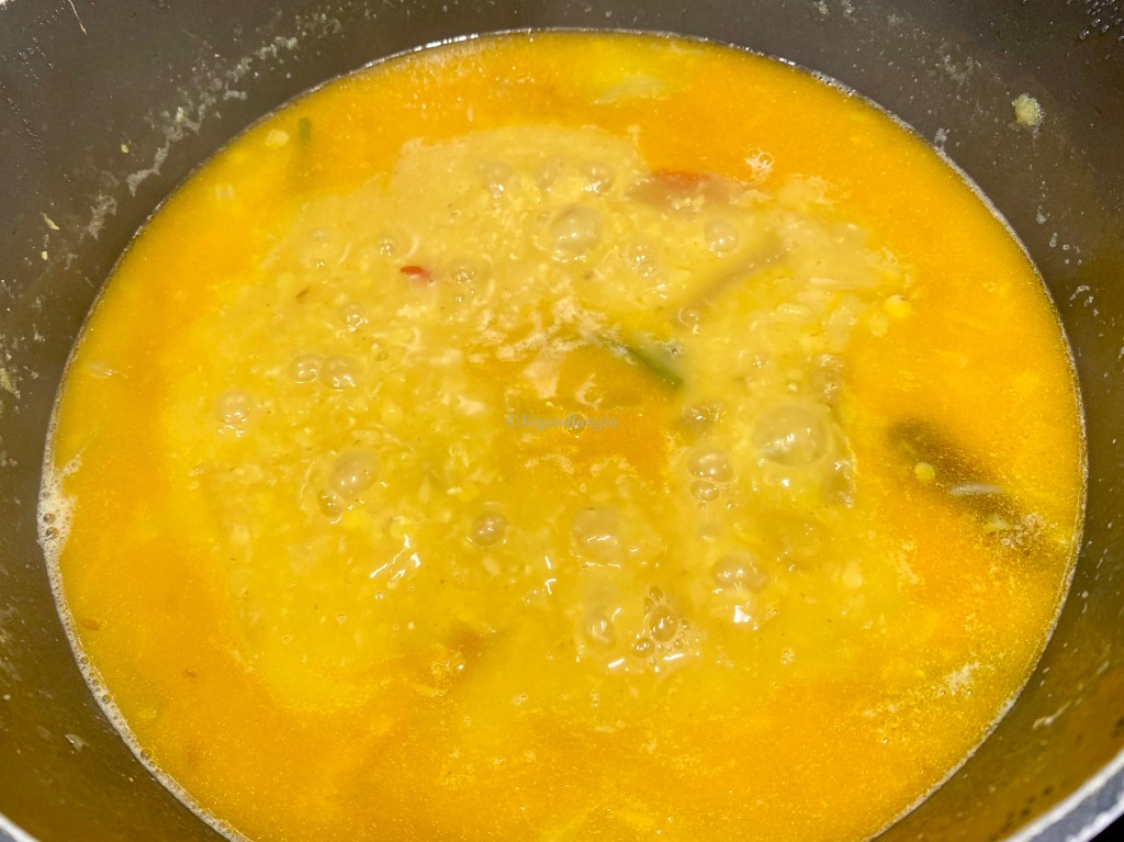 After cooking for 10 more minutes, the consistency looks like above picture. Note that I did do “phoron” as I do for other daal, because I have added onion and garlic in the very beginning. But of course you can always add extra “phoron.” It will nothing but increase the taste.