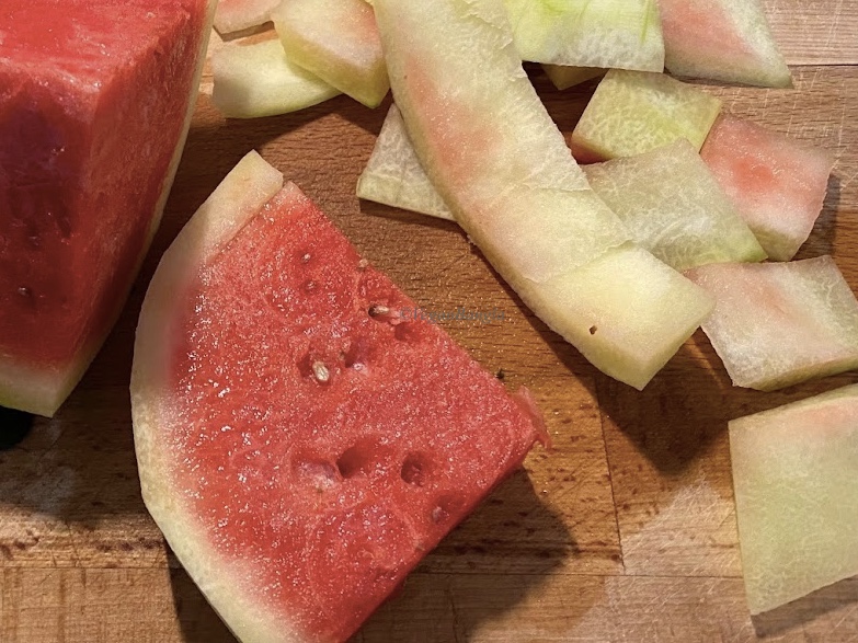 To begin, peel the green skin and then separate all the white parts of watermelon from red parts. A little bit of red parts won’t taste bad but too much will make the daal sweeter. Cut them into 1 inches pieces.