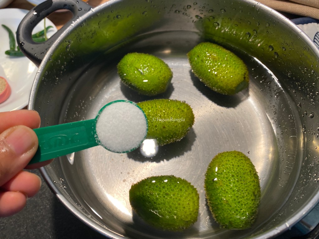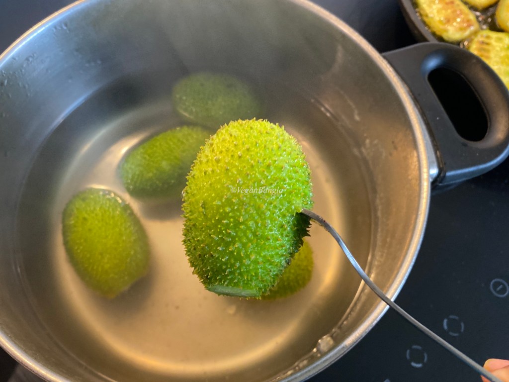 Then we need to boil the whle Kakrol until they become soft so when you poke with a fork, it goes inside completely. When boiled completely, drain kakrol and set them aside to let it cool.