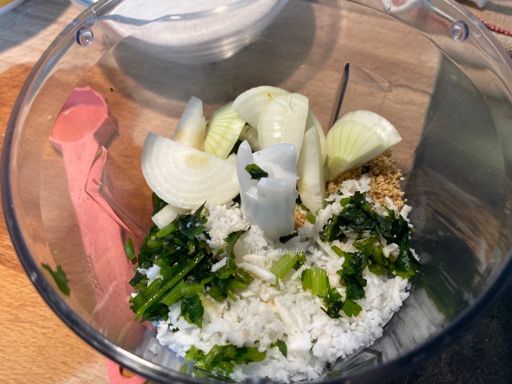 Besides Kakrol itself, we need gram flour or Beshon (Chick pea flour), rice flour and for stuffing, we need onion, shredded coconut, white poppy seeds, chili, fresh coriander and of course salt and oil.