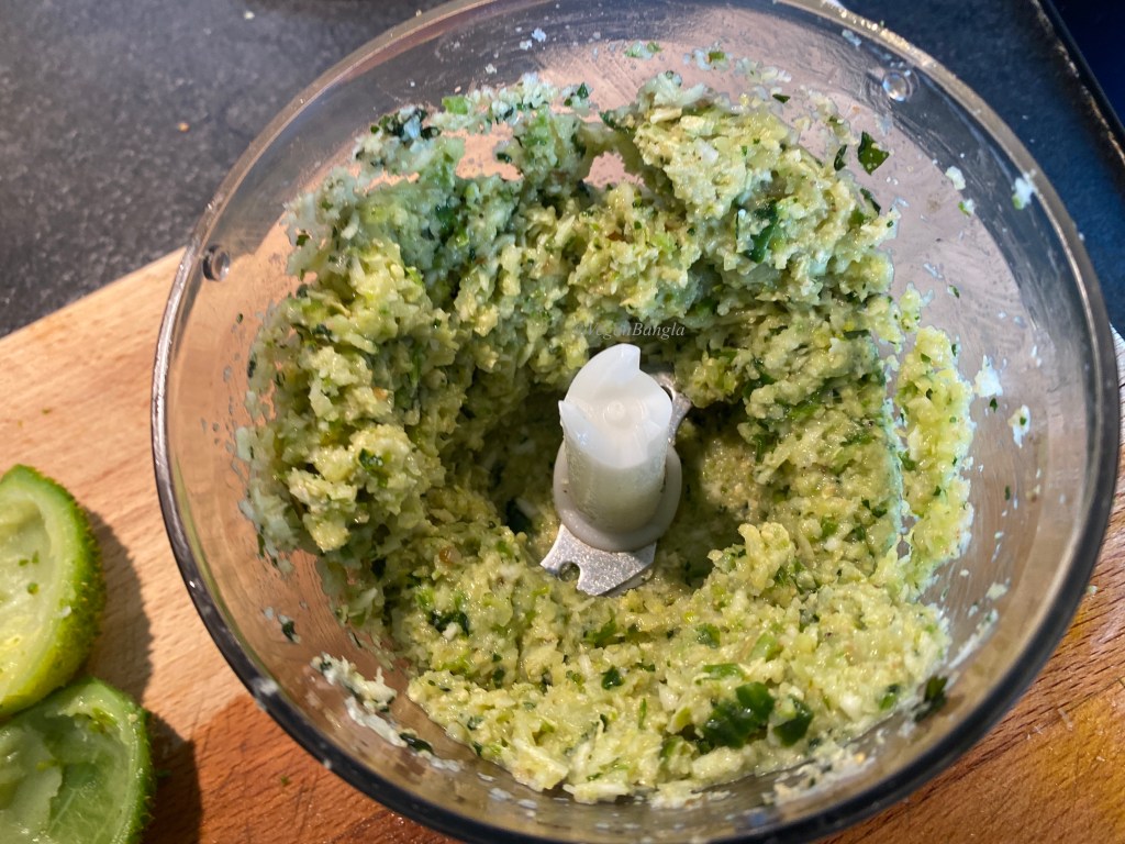 Now we will prepare stuffing for the kakrol. First we take the poppy seed paste in a food processor, then we take chopped onion, chili, fresh coriander and shredded coconut. We blend a little until they are well incorporated. Then we have to scoop out the inside part of kakrol, as we can see in the picutre number 2. Take the inside flesh and blend well with the rest of the stuffing. Taste if you need more salt.