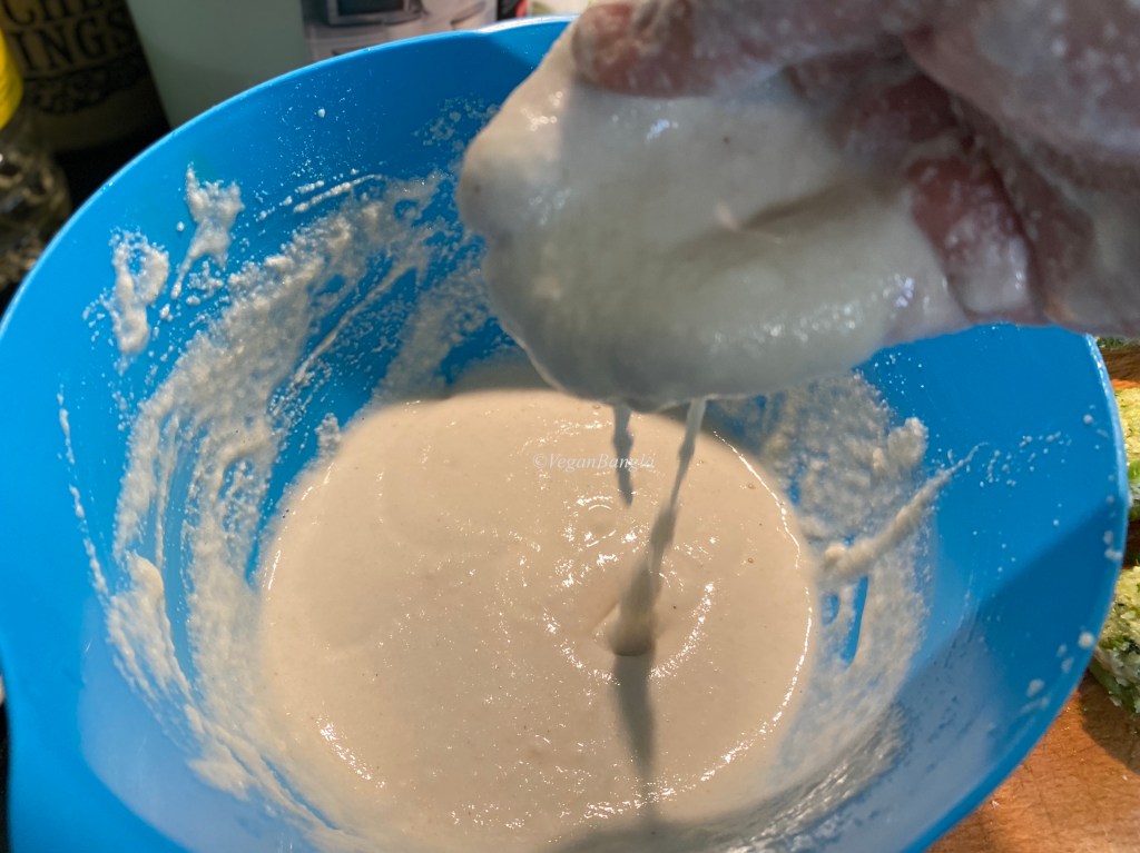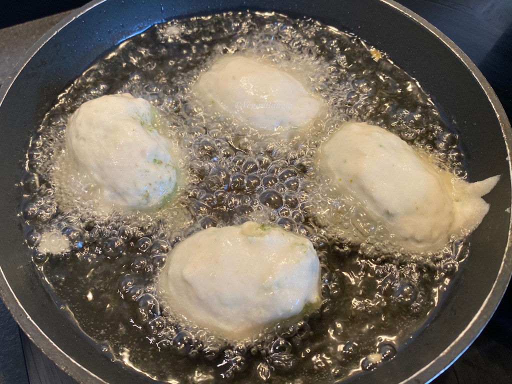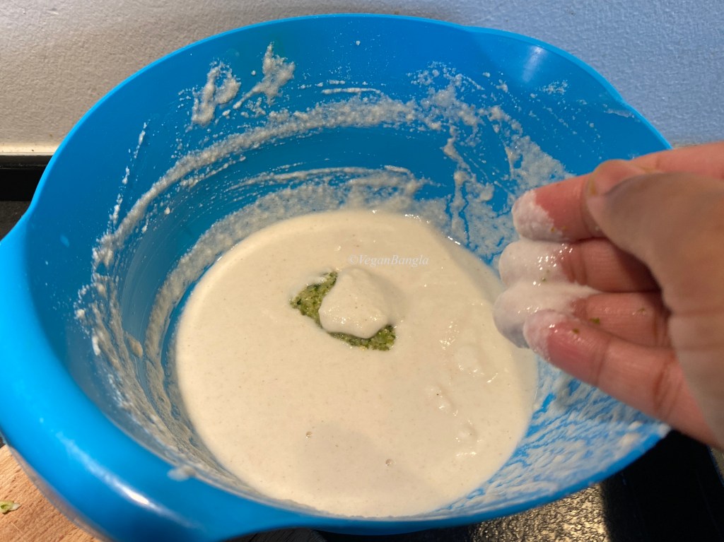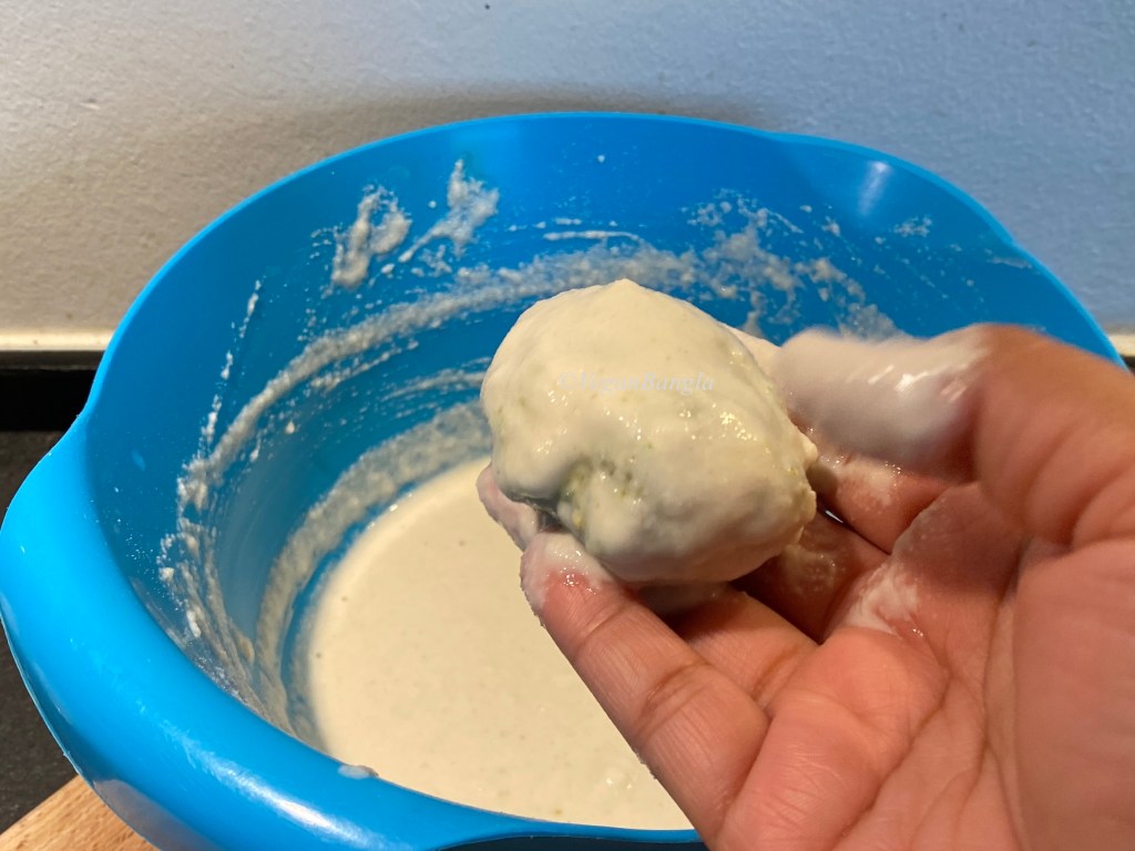 Now we have to put the stuffed kakrol fruit in the batter and carefully cover the them in batter.