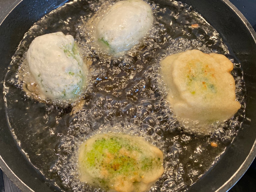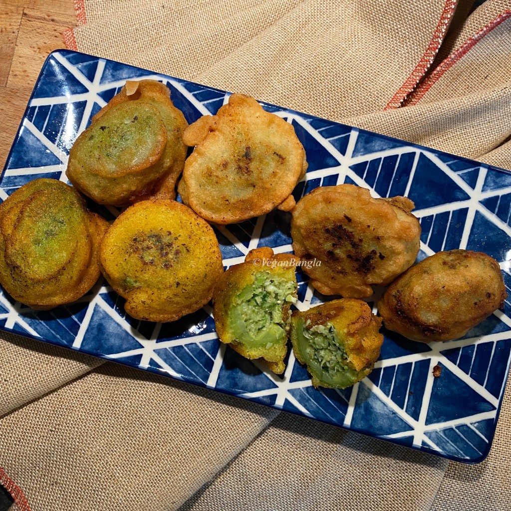 | Instruction: 1. Wash kakrol and cut the top part and remove stem. Boil them with 1 tsp of salt. Boil until it can be poked with fork. 2. Make a dry paste of poppy seed with coffee grinder or mortar pestle. 3. Take a food processor, take onion, shredded coconut, chili and coriander and blend well. 4. Cut the boiled gourd in half and scoop out the flesh with a help of a spoon. Leave the small *boat* shape gourd and add the flesh to the stuffing mixture and blend again. 5. Stuff the gourd and make round shape. 6. Make batter with gram flour, rice flour, salt and turmeric. Dip the gourds in the batter carefully. 7. Deep fry them carefully. Serve hot with rice or as a snack. |