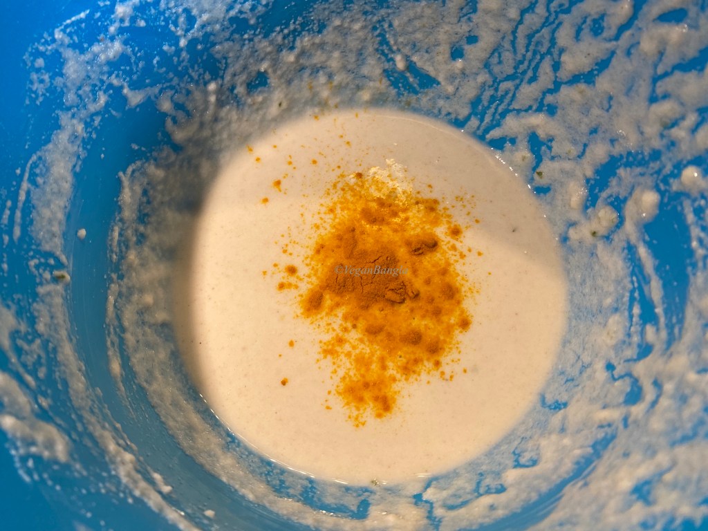 Now we have to make batter. We mix beshon, salt and rice flour and little bit of turmeric powder to add colour. Then we add water but carefully, so the batter is not too thick not too thin. As we can see int he last picutre, the batter should be dripping but not very thin.