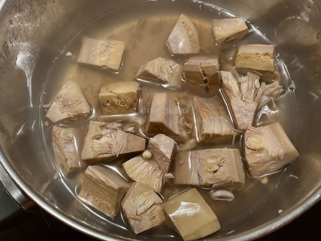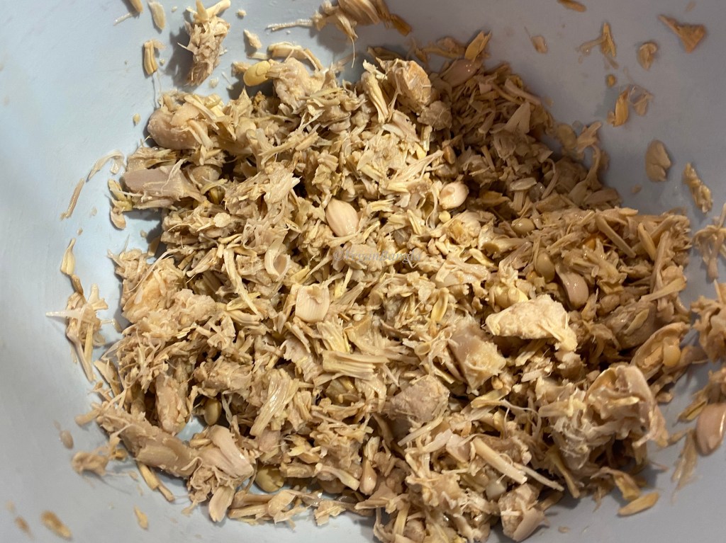 Since I wanted to make patty, I wanted it to break it into more small pieces. So I boiled the fruit for 10 minutes, then drained the water, let them get cooled and finally smash them with fork. As you can see in the third picture, the jackfruit already looks like meaty.